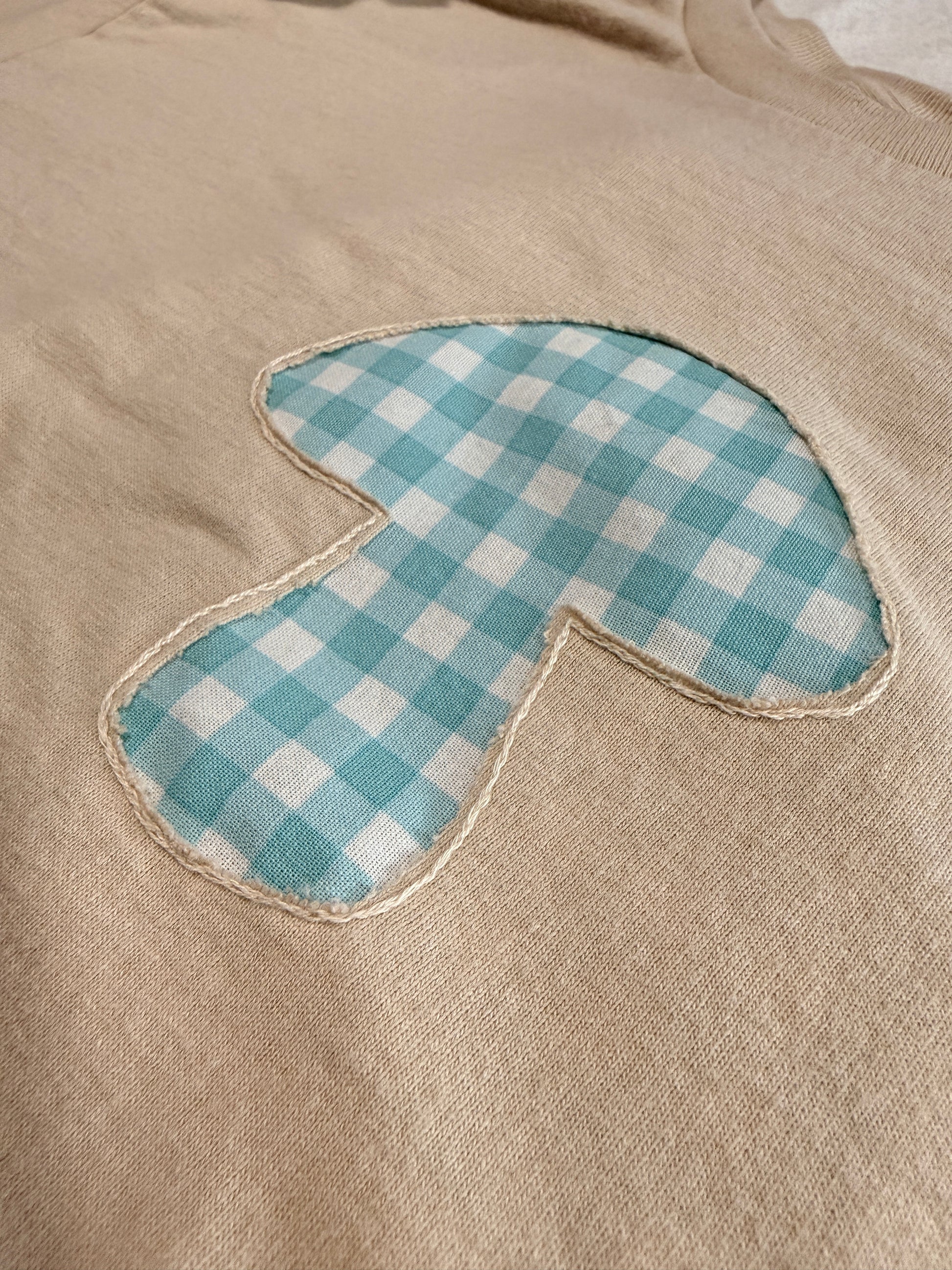 This mushroom tee features a hand-embroidered reverse appliqué mushroom in soft blue gingham — a quiet cottagecore detail designed to feel wearable, cozy, and timeless.