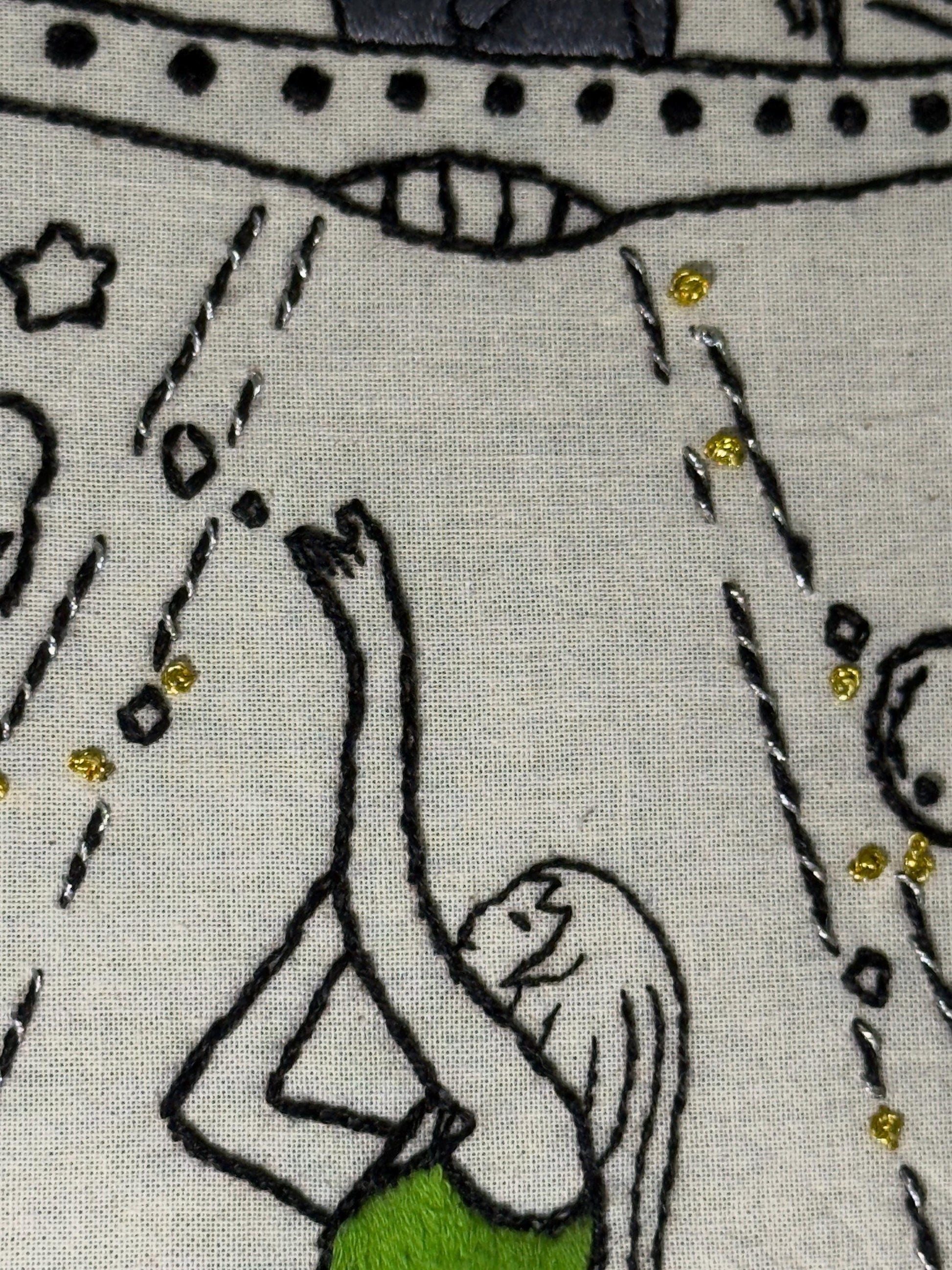 This is a finished, hand-embroidered wall art piece inspired by dreamy storytelling, music-driven imagery, and whimsical, otherworldly themes. Featuring a detailed UFO scene with soft metallic accents and expressive stitched linework, this piece feels imaginative, symbolic, and full of story — perfect for music lovers, creatives, and fans of meaningful handmade art. Each stitch was completed entirely by hand, making this hoop truly one of a kind. Once it’s gone, it won’t be recreated exactly the same.